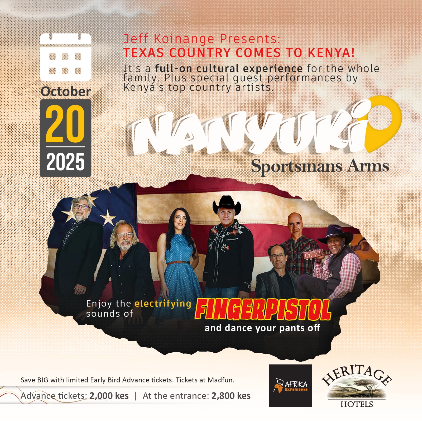 PROGRAM 3–4 pm: Happy Hour – DJ playing country classic tunes 4–5 pm: Kenyan country musicians - Kareh B and The Band 5–6 pm: Texas Two-Step Dance Lessons (led by Steffen and CJ ) 6–9 pm: Fingerpistol performance