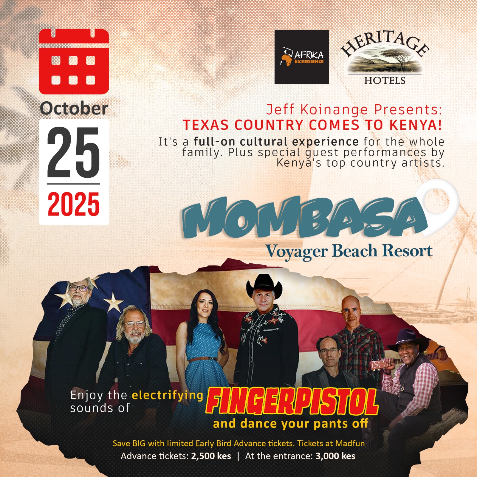 PROGRAM 4–6 pm: Happy Hour – DJ playing country classic tunes 6–7 pm: Kenyan country musicians - Kareh B and The Band 7–8 pm: Texas Two-Step Dance Lessons (led by Steffen and CJ ) 8–11 pm: Fingerpistol performance