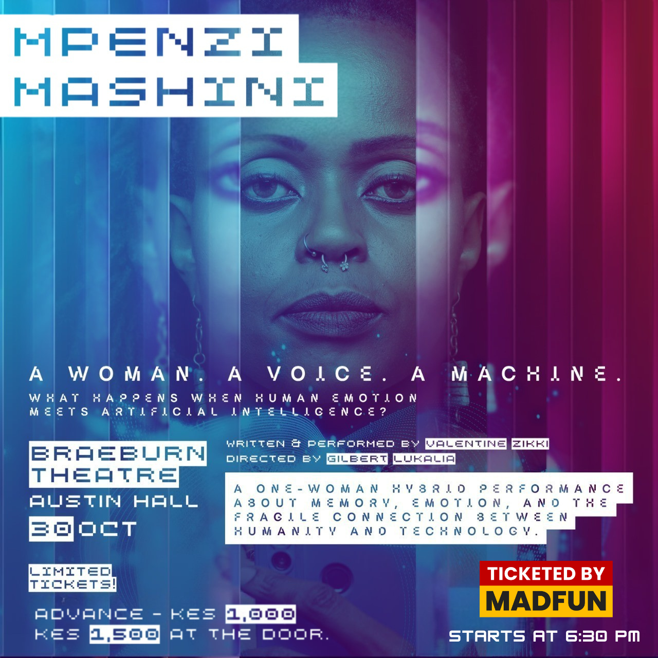 Mpenzi Mashini – The First Human and AI Theatre Experience in Africa! Mpenzi Mashini is a bold one-woman hybrid performance that merges theatre, sound, and artificial intelligence to explore love, loneliness, and what it means to be human in a digital world.Step into Nashukuru’s story, a journey that is emotional, funny, and deeply reflective. This is not just a play; it is an invitation to witness the future of storytelling where art and technology meet.Date: 30 October 2025Venue: Braeburn Theatre, Austin HallTime: Be seated by 6:15 PM | Show starts at 6:30 PMAdvance Tickets: KES 1,000 | At the Door: KES 1,500Experience the future of connection through performance.