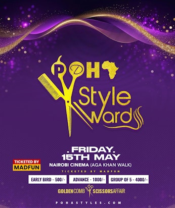 THIS THE SECOND EDITION OF THE POHA STYLE AWARDS. A CREATIVE FORUM SHOWCASING HAIRSTYLING TECHNIQUES IN A STAGE COMPETITION AND LATER AWARDING AND REWARDING THE BEST IN A GALA NIGHT GOLDEN COMB AND SCISSORS AFFAIR. We recognize the movers and shakers redefining fashion, hair, and beauty INDUSTRY. 8.00am stage styling competition 6.00pm red carpet gala awards all happening at NAIROBI CINEMA Aga Khan walk